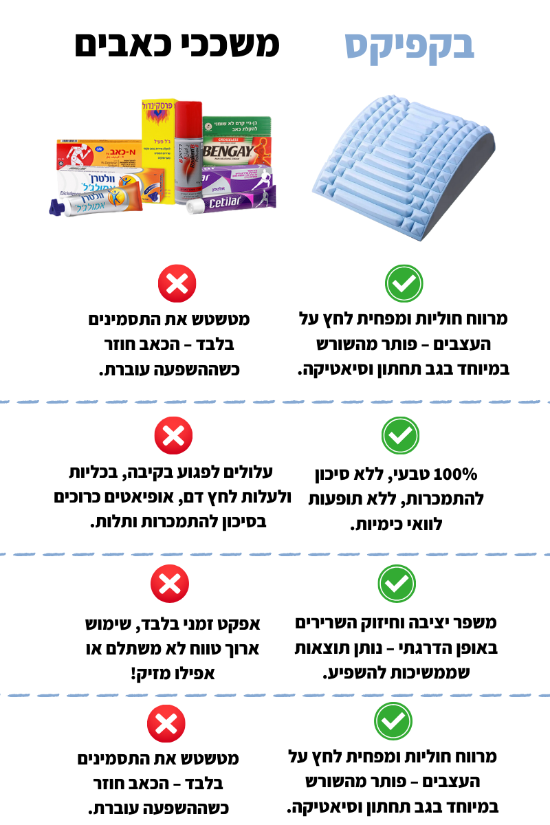 כך החוליות מתרחבות בעדינות, הלחץ על העצבים משתחרר, ואתם חווים הקלה בכאבים בצורה טבעית, נעימה וללא מאמץ.