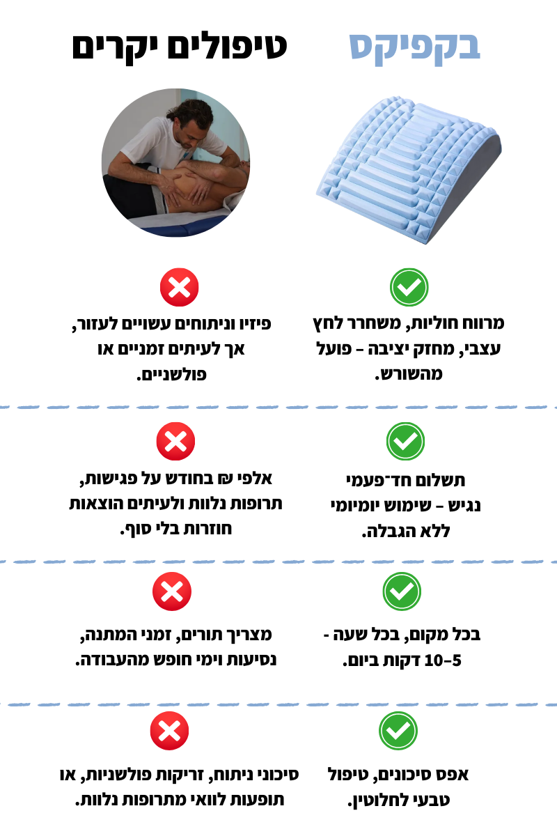 בקפיקס נועד להקל על עומס ולשחרר את הגב, והוא מתאים למגוון מצבים של כאב או תחושת מתח בגוף.